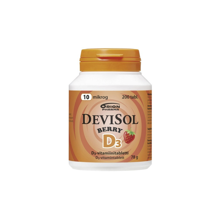 DeviSol Berry on mansikan makuinen imeskeltävä tai pureskeltava D-vitamiinitabletti. Tabletit on makeutettu ksylitolilla ja sorbitolilla ja sisältävät vain luonnollista aromiainetta. Laktoositon (maidoton), gluteeniton, hiivaton ja sokeriton. Ei sisällä soijaa eikä liivatetta. Suomessa valmistettu.